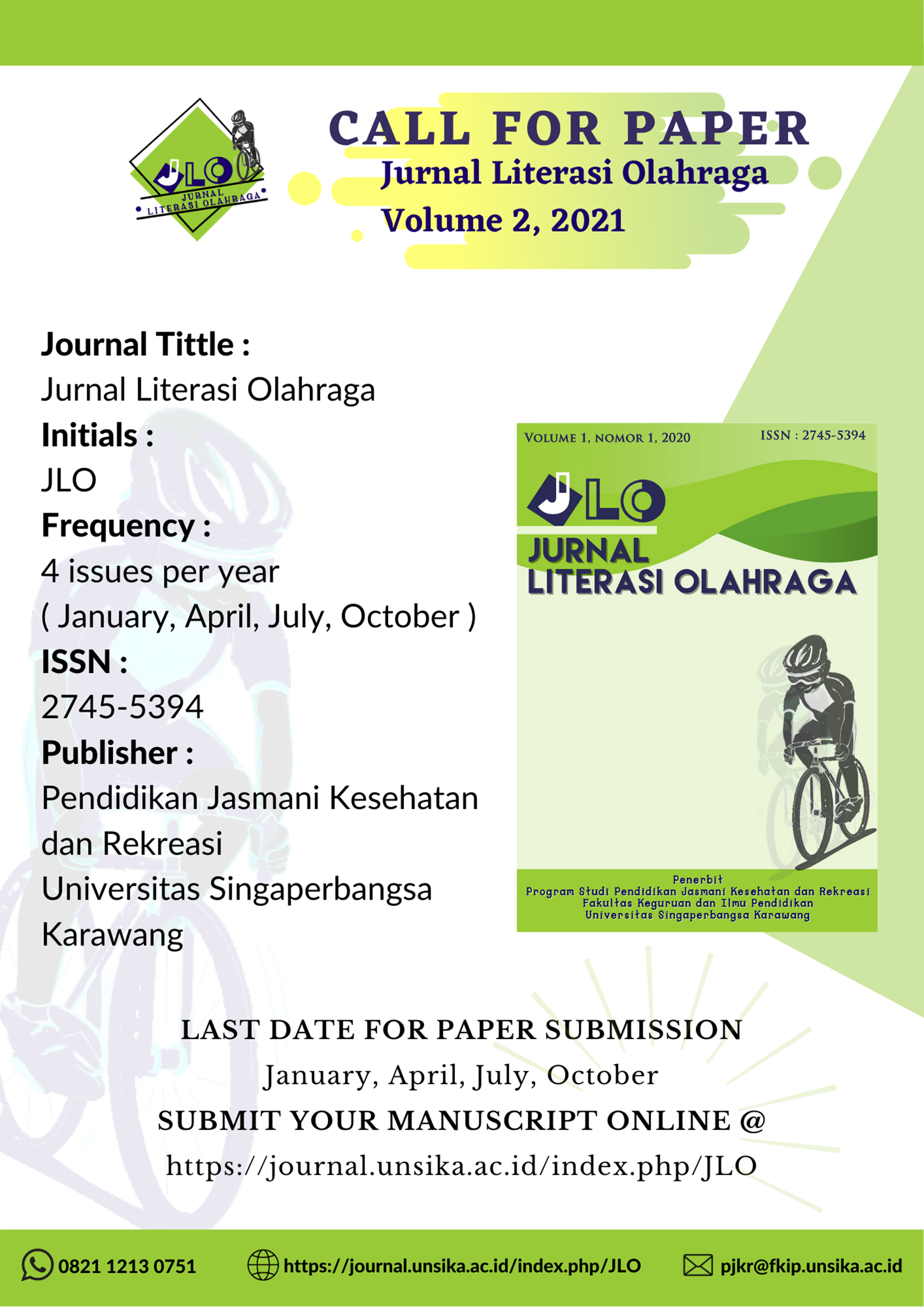 Jurnal Literasi Olahraga is a Scientific Journal Published By the Physical Education Study Program, Health and Recreation, Faculty of Teacher Training and Education, Singaperbangsa Karawang University With a Schedule of 4 Publications For 1 year.