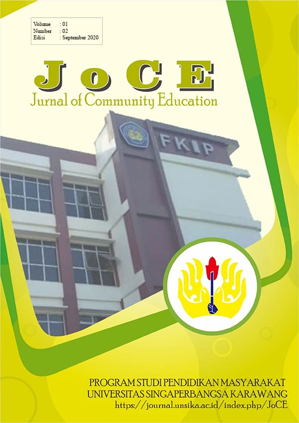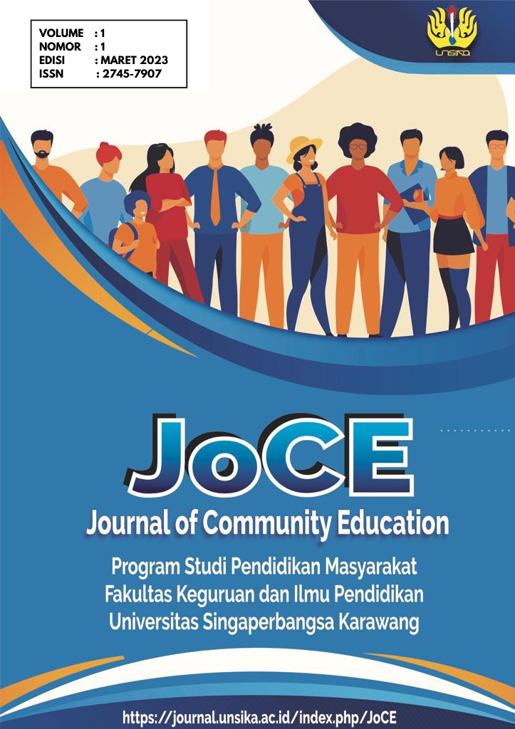 Vol. 4 No. 1JoCE (Journal of Community Education) (ISSN:2745-7907) adalah jurnal yang diterbitkan oleh Program Studi Pendidikan Masyarakat, Fakultas Keguruan dan Ilmu Pendidikan, Universitas Singaperbangsa Karawang. Jurnal ini bekerja sama dengan Himpunan Akademisi dan Program Studi Pendidikan Masyarakat Indonesia (HAPPENMASI) dan Ikatan Akademisi Pendidikan Non Formal Indonesia (IKAPENFI)